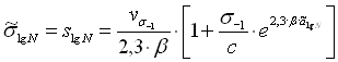 Принятие гипотезы о независимости коэффициента вариации предела выносливости от базы испытаний наряду с принятым видом уравнения кривой усталости дает возможность выразить зависимость степени рассеяния долговечности от уровня амплитуды цикла напряжений и средней долговечности на всем протяжении кривой усталости.