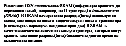 Операти́вная па́мять (англ. Random Access Memory -RAM, память с произвольным доступом) — энергозависимая часть системы компьютерной памяти, в которой временно хранятся данные и команды, необходимые процессору для выполнения им операции. Обязательным условием является адресуемость (каждое машинное слово имеет индивидуальный адрес) памяти. Передача данных в оперативную память процессором производится непосредственно, либо через сверхбыструю память. Содержащиеся в оперативной памяти данные доступны только тогда, когда компьютер включен. При выключении компьютера содержимое стирается из оперативной памяти, поэтому перед выключением компьютера все данные нужно сохранить. Так же от объема оперативной памяти зависит количество задач, которые одновременно может выполнять компьютер.
