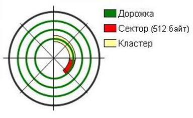 Так как каждый сектор имеет размер 512 байт, то плотность записи данных на дорожках, лежащих ближе к центру, выше, чем на крайних.