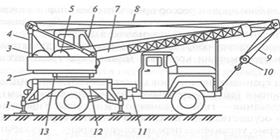 управления; 7 – стрела; 8 - троса; 9 - полиспаст; 10 – крюковая обойма; 11 – рама авто-