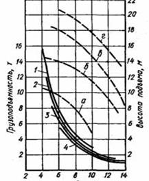 В паспорте каждого стрелового крана имеется кривая, показывающая его грузоподъемность на различных вылетах стрелы.