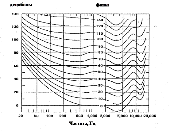 Условно приняли, что к=1 для звука частотой 1000Гц. Единицей громкости является Фон – такая громкость звука, при которой интенсивность звуковой волны частотой 1000Гц в 10 раз превышает пороговую интенсивность. Для звуков других частот находят такую интенсивность, которая бы вывала такое же ощущение громкости, как звук частотой 1000Гц, после чего строят кривые равной громкости (Рис 2).