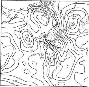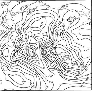 Рис. 3.5. Отклонение (м) поверхности геоида от эллипсоида вращения (Мир географии, 1984)