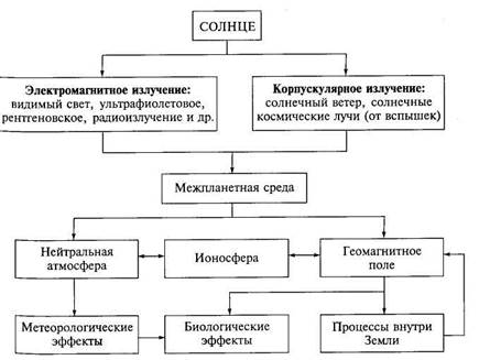 Солнечно-земные связи. Генеральная схема солнечно-земных связей включает электромагнитное и корпускулярное излучения (рис. 3.7), которые обусловливают ряд процессов и явлений во всех геосферах (например, полярные сияния, магнитные бури и связанные с ними последствия). Активность Солнца различна, выделяют периоды, когда в результате происходящих на Солнце процессов наша планета получает дополнительное (по сравнению с излучением Солнца в спокойном состоянии) излучение, которое влияет на характер многих земных процессов.
