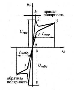 Динамическая вольт-амперная характеристика дуги ид = f(iд), отражающая связь мгновенных значений напряжения и тока при их быстром изменении, характерном для сварки на переменном токе частотой 50 Гц, показана на рис. 3.2. Ее можно построить по данным осциллограммы (рис. 3.1, а) или получить на осциллографе, подавая на горизонтальную развертку сигнал, пропорциональный току, а на вертикальную — напряжение дуги. Номера характерных точек на рис. 3.2 совпадают с индексами точек осциллограммы (рис. 3.1,а). Здесь на участке 1-0 изображен процесс угасания дуги в полупериоде обратной полярности, 0-2 — процесс зажигания в полупериоде прямой полярности, 2-3 — дуговой разряд при нарастании тока, 3-4 — дуговой разряд при спаде тока, 4-— угасание дуги и т. д.