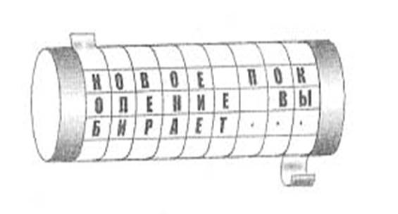 Когда эфорам нужно сообщить какую-нибудь важную тайну, они вырезают длинную и узкую, вроде ремня, полосу папируса, плотно, без промежутков наматывают ее на свою скиталу и пишут на нем текст. Затем снимают полосу и без палки отправляют ее военачальнику. Так как буквы на ней стоят без всякой связи, разбросаны в беспорядке, прочитать написанное он может, только взяв свою скиталу и намотав на нее вырезанную полосу, чтобы, водя глазами вокруг палки и переходя от предыдущего к последующему, иметь перед собой связное сообщение» . Ключом является диаметр цилиндра.