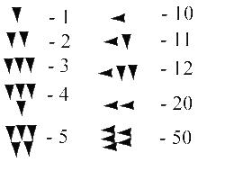 Вавилоняне поступали так: записывали все числа от 1 до 59 по десятичной системе, применяя принцип сложения. При этом они пользовались всегда двумя знаками: прямым клином для обозначения 1