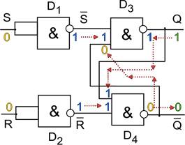 1. Пусть на входе R установлена 1, на S - 0. Логические элементы D1 и D2 инвертируют эти сигналы, т.е. меняют их значения на противоположные. В результате на вход элемента D3 поступает 1, а на D4 - 0.