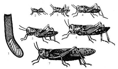 Рис. 1. Перелетная саранча (неполное превращение): 1 – кубышка яиц, 2-6 – личинки I-V возрастов; 7 – взрослое насекомое