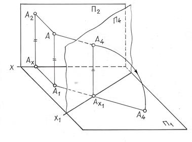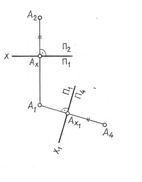 , необходимо: провести новую ось проекций Х1, которая определяет положение горизонтально-проецирующей плоскости П4, затем из горизонтальной проекции точки А1 опустить перпендикуляр на новую ось Х1. На построенном перпендикуляре отложить (от новой оси) отрезок Аx А4=АxА2. Полученная таким образом точка А4 является проекцией точки А на плоскость П4.