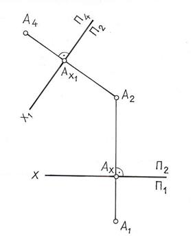 Предположим, что при решении какой-либо задачи мы нашли целесообразным заменить плоскость П2 другой фронтальной плоскостью П4, перпендикулярной к плоскости П1. Линия пересечения плоскостей проекций П1 и П4 называется новой осью проекций и обозначается Х1. Построим ортогональные проекции точки А в системе