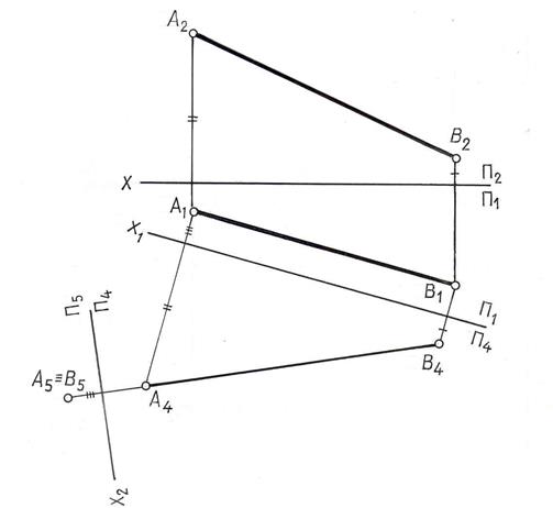 /А4В4/=/АВ/ и угол φ, образованный проекцией А4В4 с осью Х1 равен углу наклона прямой АВ к плоскости П1.