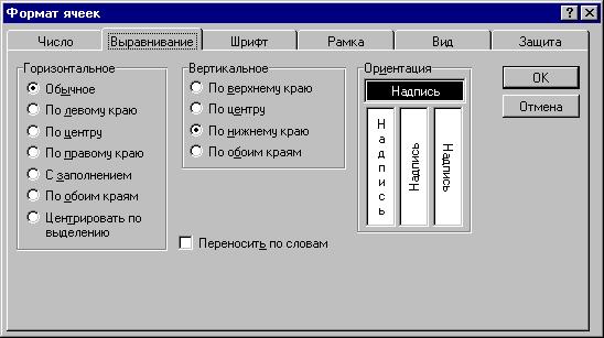 Для того, чтобы установить различное выравнивание, выберите пункт Ячейки из меню Формат. Выберите вкладку Выравнивание
