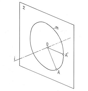 Все точки геометрической фигуры, не лежащие на оси вращения, вращаются в плоскостях, перпендикулярных оси вращения (рис. 10.9): Σ^i; AÎΣ . Центр О окружности m, которую описывает точка А , является точкой пересечения оси i с плоскостью Σ ; O= i∩Σ. Отрезок АО является радиусом R окружности m.