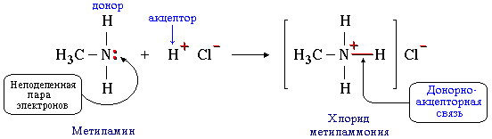 б) такая связь образуется между атомом азота в молекуле метиламина CH3NH2 и протоном H+ кислоты HCl: