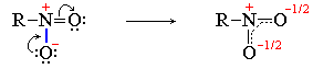 В приведенных формулах нитросоединения связи азота с кислородом неравноценны. Однако, как показывают результаты физических исследований, эти связи энергетически совершенно одинаковы. Следовательно, электронная пара, обусловливающая отрицательный заряд, не сосредоточена целиком на каком-либо одном кислородном атоме, а несколько смещена к азоту при одновременном смещении от азота ко второму кислородному атому подвижной π-электронной пары двойной связи. В результате выравнивания электронной плотности в нитрогруппе формальный отрицательный заряд (-1) распределяется поровну (-1/2) между обоими атоми кислорода: