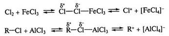 Реакции электрофилъного замещения (SE). Для ароматическихсоединений бензольного ряда, конденсированных и гетероциклических ароматических соединений характерны реакции SE –типа. Особенностью реакций SE является то, что атакующий реагент — электрофил — образуется на первой стадии реакции в присутствии кислот Льюиса – AICI3, FeBr3 (реакции галогенирования, алкилирования по Фриделю -Крафтсу.) либо в условиях кислотного катализа (алкилирование алкенами и спиртами, нитрование), например: