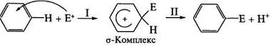 Образовавшаяся электрофильная частица Е+ атакует нуклеофильный центр — бензольное ядро. В результате атаки образуется неустойчивая структура (σ-комплекс) с нарушенной системой кругового сопряжения. Эта стадия является лимитирующей (стадия I). Стабилизация структуры происходит путем отщепления протона от σ -комплекса с образованием конечного продукта. В общем процесс (Е+ = Cl+, Br+, R+, NO2+ и др.) протекает по схеме:
