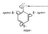 - Электроноакцепторные заместители (-М-эффект), напротив, снижают электронную плотность в бензольном кольце, что приводит к снижению реакционной способности реакционного центра субстрата; такие заместители ориентируют электрофил в .мета-положение (мета-ориентанты, или ориентанты II рода.