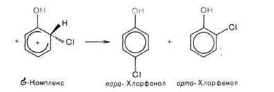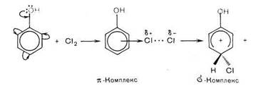 Например: хлорирование фенола протекает по механизму электрофильного замещения в ароматическом ядре через стадии образования π- и σ- комплексов. ОН группа является сильным активатором и орто-, napa-ориентантом. Это обусловливает мягкие условия реакции и образование двух продуктов с замещением в орто- и пара положениях бензольного кольца.