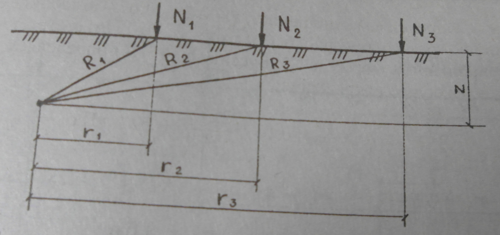 Определить вертикальное сжимающее напряжение в точке М от действия сосредоточенной силы N, приложенной к поверхности грунтового основания, если известно: N=25.0кН, точка М находится на глубине 3 м от поверхности и на расстоянии 2 м в сторону от действия силы.