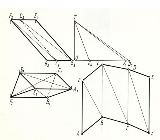 Решение. Каждую боковую грань призмы делим диагональю на два треугольника. Натуральные длины диагоналей AD, BE, CF определим как гипотенузы прямоугольных треугольников, у которых одним катетом является высота призмы, а другим – горизонтальная проекция соответствующей диагонали (A1D1, B1E1, C1F1). В нашем примере боковые ребра призмы параллельны фронтальной плоскости проекций и проецируется на П2 в натуральную величину, а стороны основания параллельны горизонтальной плоскости проекций и проецируются на П1 в натуральную величину.