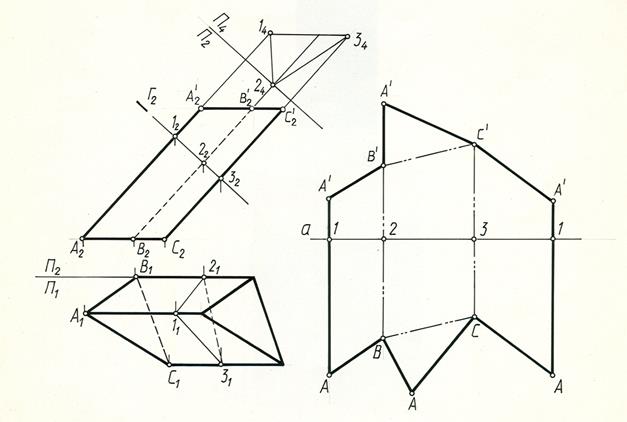 В нашем примере эта плоскость является фронтально-проецирующей плоскостью и пересекает призму по треугольнику 1 2 3. (122232, 112131) Стороны треугольника определяют расстояние между боковыми ребрами. Определяем натуральную величину сечения (треугольник A4B4C4), используя способ замены плоскостей проекций. Стороны нормального сечения; последовательно отложим на прямой а: 1-2=14-24, 2-3=24-34, 3-1=34-14. Полученный отрезок 1-1 равен периметру нормального сечения.