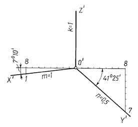 В прямоугольной диметрии коэффициенты искажения m = k, а третий n – не равен им. Для практических целей применяется диметрия, у которой m = k и n=0¸5m. При таком соотношении коэффициентов искажений аксонометрические оси расположены под углами, указанными на рис. 13.3. Подставляя в формулу прямоугольной аксонометрии значения m = k и n=0¸5m, получим m = k =0¸94; n = 0¸47. Однако для практических целей применяются приведенные коэффициенты искажения (m = k = 1 и т = 0,5). Изображение, построенное с приведенными коэффициентами искажения, будет увеличено в 1,06 раза (1:0,94=0,5:0,47=1,06).