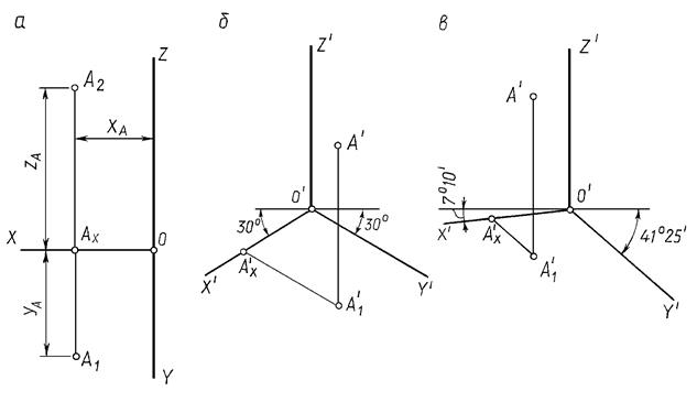 Пример.Построить прямоугольную изометрию и прямоугольную диметрию точки А (рис. 13.6 а).