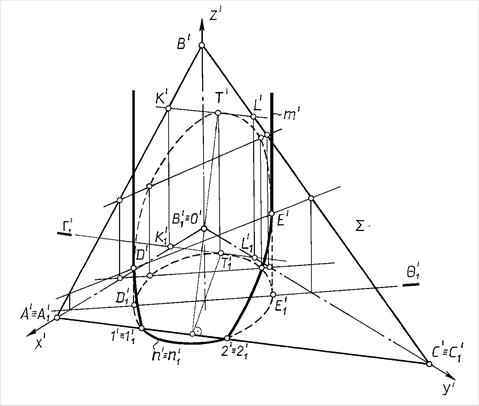 3. Определяем точку Т¢ пересечения прямой l' и плоскости A¢B¢C¢, а именно l' ∩1¢ 2¢ = Т¢. По принадлежности кl1¢, находим вторичную проекцию точки пересечения Т1¢.