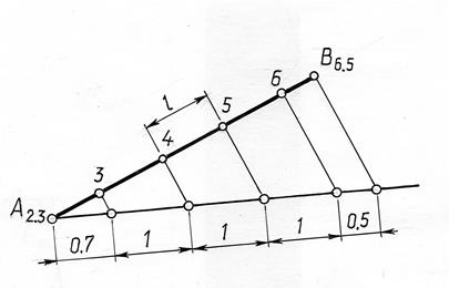 1-й способ (рис. 14.7) - использование пропорционального деления отрезка. Через один из концов отрезка (например, А2,3) проводитсявспомогательная прямая любого направления, и на этой прямой в произвольном масштабе откладываются величины, соответствующие превышениям между концевыми и искомыми точками отрезка прямой. Построенная последняя точка на вспомогательной прямой соединяется со вторым концом отрезка, и через точки деления проводятся прямые параллельно замыкающей прямой. Эти прямые определяют на заданной проекции отрезка искомые точки.