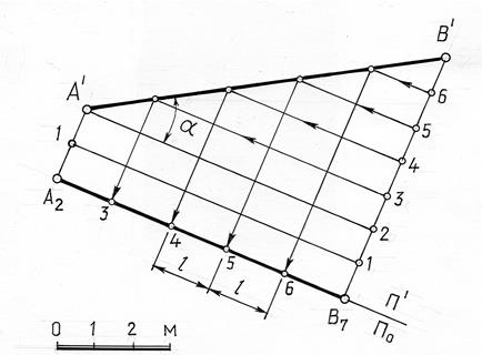 совпадает с проекцией отрезка. Восстановив перпендикуляры к проекции отрезка (линии связи) в точках, являющихся проекциями концов отрезка, и, отложив на них отрезки, равные высотам этих точек, получают А/В/- натуральную величинуотрезка АВ и угла a - угла наклона прямой к плоскости П0. Затем с помощью прямых, параллельных проекции отрезка, на А/В/ определены точки с целыми отметками. После чего построены проекции этих точек на заданной проекции отрезка.