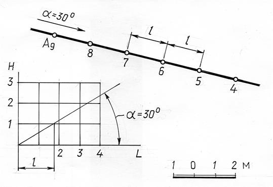 На рис. 14.9 показано градуирование прямой, которая задана горизонтальной проекцией, точкой А9 и углом наклона к плоскости проекций. График уклона прямой выполняется в масштабе чертежа: по одной (горизонтальной) оси откладываются заложения, а по другой (вертикальной) превышения Н. Из начала координат проводится прямая под заданным углом a к оси L. На этом графике величина заложения, соответствующая единице превышения и будет интервалом l данной прямой.