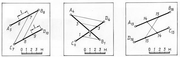 Две прямые в пространстве могут пересекаться, скрещиваться и быть параллельными. Однако отсутствие второй проекции не дает возможности определить взаимное расположение прямых непосредственно по чертежу, не проведя предварительно вспомогательных построений. Так взаимное расположение прямых можно определить, если проградуировать прямые и сравнить интервалы, уклоны и отметки точек пересечения проекций прямых. Отметим признаки характерные для различных случаев расположения прямых.