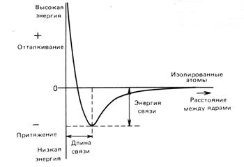 Наиболее общие признаки химической связи на примере молекулы, образованной из двух атомов, представлены на рис. 1. К двухатомным молекулам относятся такие, как H2, N2. Факторами, определяющими образование химической связи, являются межъядерное расстояние и энергия взаимодействия атомов. На рис. 1 показано изменение энергии взаимодействия двух атомов, которое происходит в результате их сближения. На больших расстояниях друг от друга энергия взаимодействия атомов близка к нулю. При сближении атомов между ними возникает слабое, по сравнению с другими силами, Ван-дер-Ваальсово взаимодействие, которое обуславливает притяжение и увеличение энергии связи. Когда межъядерное расстояние становится соизмеримым с размерами электронных оболочек атомов, появляется наряду с притяжение еще и отталкивание. При таких расстояниях между атомами имеют место два конкурирующих взаимодействия: притяжение и отталкивание. Притяжение возникает между положительно заряженными ядрами одного и отрицательно заряженными электронами другого атома. Одновременно с этим возникает отталкивание между одноименно заряженными ядрами и электронами обоих атомов. В начале при сближении атомов преобладает притяжение, но с некоторого расстояния энергия отталкивания резко возрастает. Этому расстоянию соответствует минимум на кривой. Данное расстояние характеризует устойчивость рассматриваемой системы двух атомов и соответствует образованию стабильной молекулы. Подобная стабильность обеспечивается равенством сил притяжения и отталкивания. Таким образом, химическая связь между атомами в двухатомной молекуле характеризуется равновесным межъядерным расстоянием или длиной связи и энергией связи (энергией диссоциации). Приведенная картина имеет лишь качественный характер. Она не объясняет существование разных типов связей. Более точное и строгое рассмотрение природы химической связи требует привлечения законов, описывающих поведение электронов и атомов на микроскопическом уровне.