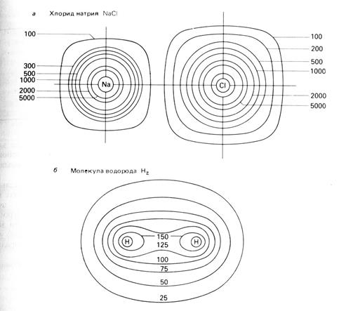 Результат приближенного расчета распределения электронной плотности в молекуле воды показан на рис. 2. Контурные линии соединяют места одинаковой электронной плотности. Числами указаны значения электронной плотности.