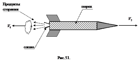 Примером реактивного движения является движение ракеты. В простейшем случае ракета – есть цилиндр, закрытый с одной стороны и заполненный порохом (Рис.51). До воспламенения пороха суммарный импульс пороха и ракеты равен нулю. Когда порох горит, продукты сгорания выбрасываются из сопла ракеты с большой