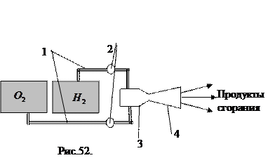 по трубам – 1, с помощью турбин – 2 поступает в камеру сгорания – 3 , где происходит сгорание водорода и продукты сгорания с большой скоростью выбрасываются из сопла – 4 , создавая реактивную силу тяги.