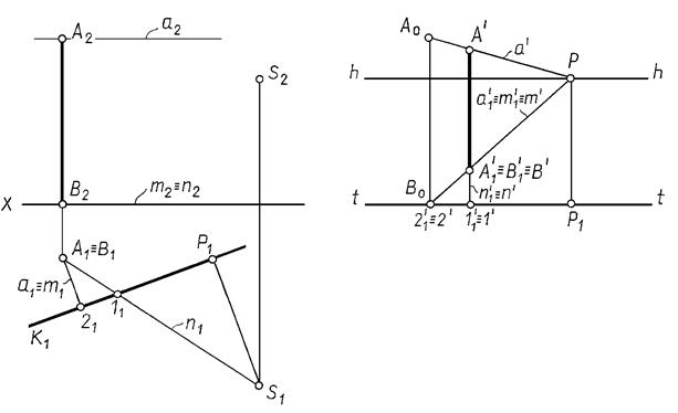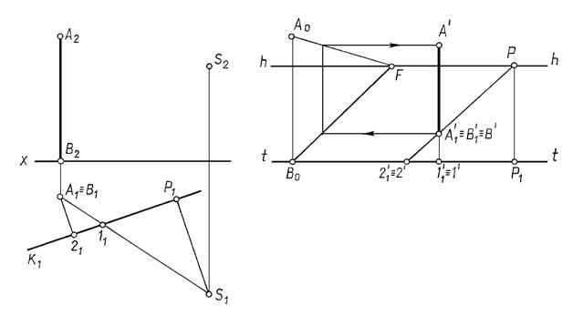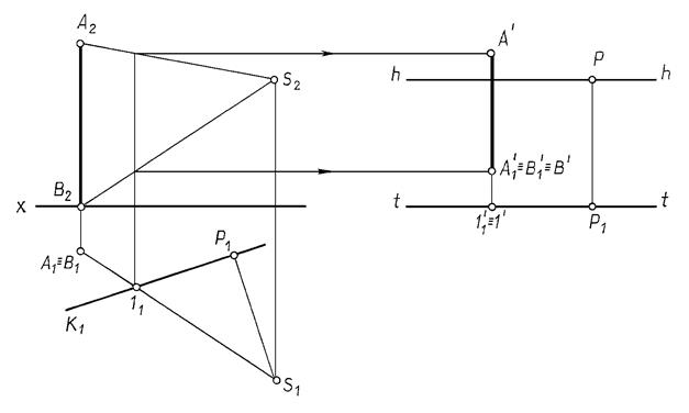 Также эту задачу можно решить радиальным способом рис 17. 4, т.е. найти точки пересечения проецирующих лучей SA и SB с картиной K