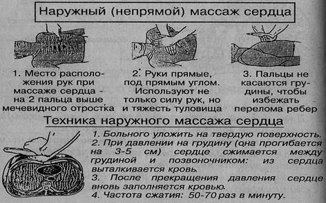 НЕПРЯМОЙ МАССАЖ СЕРДЦА – лечебные приемы, применяемые при остановке сердечной деятельности. Принцип: при сильном толчкообразном сдавливании грудной клетки кровь, наполняющая желудочки сердца, выталкивается в аорту и легочную артерию. При отведении рук оказывающего помощь грудная клетка пострадавшего расширяется, и кровь поступает из вен в предсердия, а из предсердий в желудочки.