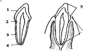 1 – коронка, 2 – шейка, 3 – корень, 4 – верхушка корня,
