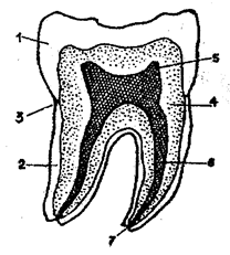 5 – полость коронки, 6 – корневой канал, 7 – острие верхушки зуба.