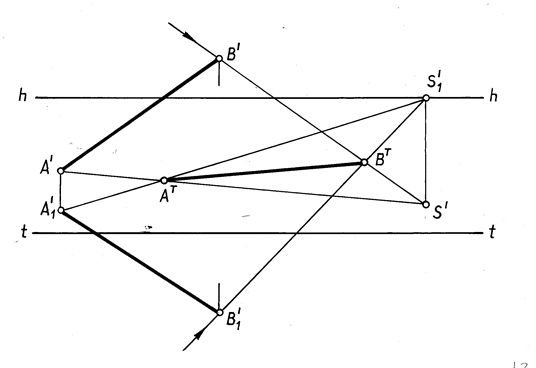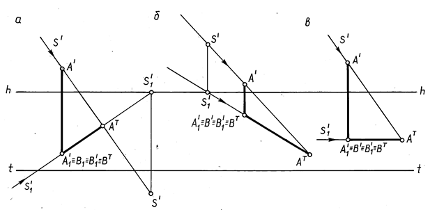 На рис. 18.12 построены падающие тени от вертикального отрезка АВ при различных относительно его положениях источника света
