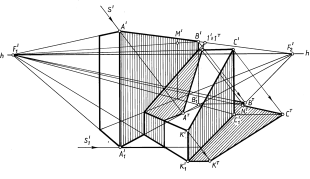 Чтобы найти в перспективе тень АТ точки А, нужно через А’ и S’ провести перспективу светового луча, а через вторичную проекцию А1’ – вторичную проекцию луча (прямую А1’S1’). Пересечение перспективы луча с его вторичной проекцией определит тень точки А на предметной плоскости.