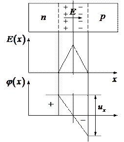 Если бы электроны и дырки были нейтральными, то их концентрация выровнялась бы по всему объему кристалла. На самом же деле на границе раздела образуются два слоя противоположных по знаку зарядов. Область пространственных зарядов представляет собой p-n переход. Его ширина не превышает десятых долей микрометра. Пространственные заряды в переходе образуют электрическое поле направленное от положительно заряженных ионов к отрицательно заряженным.