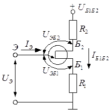 Участок между базами Б1 и Б2 однопереходного транзистора представляет собой омическое сопротивление в несколько КОМ с линейной вольт амперной характеристикой. Поэтому напряжение UБ1 Б2 распределяется по базам пропорционально их сопротивлениям. Эти напряжения соответственно равны UЭБ1 и UЭБ1. Полярность напряжения UБ1 такова, что в исходном состоянии эмиттерный