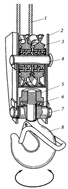 1 — канат; 2 — щека; 3 — блок; 4 — ось; 5 — гайка; 6 — подшипник; 7 — траверса; 8 — крюк