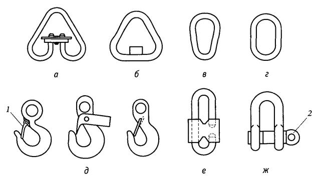 а — типа РТ; б — типа Т; в — типа О; г — типа Ов; д — крюки; е — карабин; ж — скоба; 1 — замок; 2 — штырь