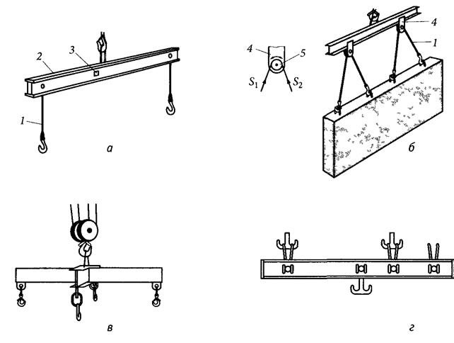 г — разноплечая балансирная; 1 - ветвь; 2 — балка; 3 — клеймо; 4 — обойма; 5 — уравнительный блок; S1, S2 — натяжение ветвей