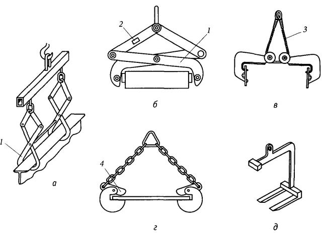 Подхваты заводятся под груз или в специальные отверстия на грузе. К ним относятся вилочные захваты (рис. 3.16, д), предназначенные для строповки поддонов.